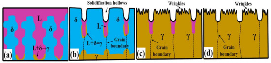 In the process of phase transformation, one thing to note is that the previously solidified surface profile will not be completely subverted by the peritectic transformation contraction because its shrinkage is much smaller than the solidification shrinkage. In addition, the corrosion of the longitudinal section shows that primary dendrites grow in a certain direction and the dendrite spacing is consistent with the rise in grain spacing on the surface, consistent with the literature [38]. Figure 4 is a schematic diagram describing the processes of surface solidification and microstructure evolution for hypo-peritectic steels (S1). There are convexities formed representing the priority delta-Fe during solidification and the initial grain boundaries are located in hollows, and then the peritectic transformation result in the contraction wrinkles emerging on crystals.