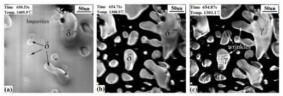 Figure 5 shows the in-situ observational results for ultra-low carbon steel (S2). At first, δ began to precipitate at 1462.5 °C and then grow gradually (Figure 5a), following a region of single δ. There are also some forming δ crystals and hollows being generated during the liquid solidifying contraction. The transition of δ to γ occurs at 1308.9 °C, which took about 0.16 s (Figure 5b,c). Surface wrinkles and contraction lines were produced on the crystals because of the δ-γ transformation (Figure 5c). As we observed for the ultra-low carbon steel, surface deformation is relatively smaller than for the hypo-peritectic steel, from comparing the shallow shrinkage lines of S2 with the shrinkage grooves of S1. This is due to the higher tensile strength of the shell and the lower the temperature at which the phase transition occurs.
