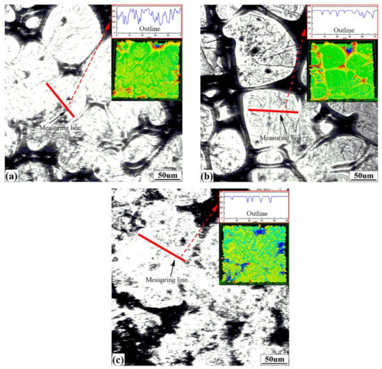 Figure 7 shows the surface morphologies and 3D images obtained by CSLM for the three steels. The microstructure surfaces of steels are composed of solidifying hollows and raised crystals. After completing 3D scanning, surface outlines and surface roughness can be extracted by manually “drawing lines” on the crystals’ surfaces, where measuring lines should exist on “one grain” and not extend into hollows as far as possible, as shown in Figure 7a–c by red solid lines. The outlines are displayed in the upper right of Figure 7a–c. There are significantly more fluctuations in the hypo-peritectic steel than in other steels. This variation is closely related to their solidification characteristics.