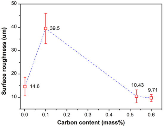 Figure 8 shows the relationship between the surface roughness (Ra) and the carbon content. The maximum Ra value is found with the hypo-peritectic steel (Ra = 39.5 um), ~4 times greater than the ultra-low carbon steel and high carbon steels. The larger surface roughness indicates that it encounters severe uneven surface shrinkage deformation and may be vulnerable to surface defects. This result agrees with previous research regarding the effect of carbon content on the maximum reaction force and uneven shell growth of steels [32,39].