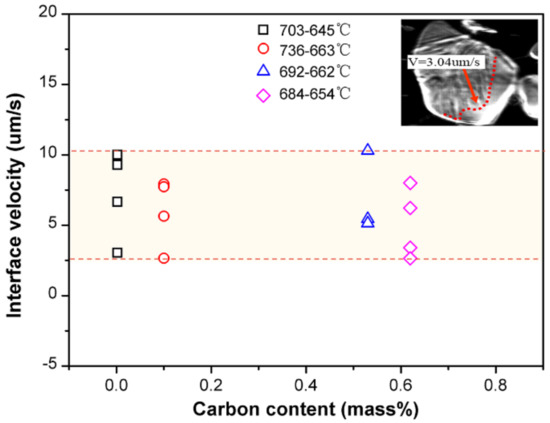 Phase transition interface velocity for steels at a low temperature range with a cooling rate of 1 °C/s.