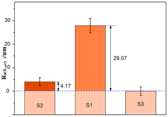 The volume shrinkage due to the δ–γ transformation is believed to be the key cause of surface defects in peritectic steels (S3). According to Section 3.2.1, the deeper hollows that appeared were caused by the solidification contraction and are independent of the δ–γ transformation. Therefore, in order to evaluate the volume shrinkage degree caused by phase transition, measurement of the variation in surface roughness on the grains is a valid strategy to avoid the influence of the liquid and the solidification contraction.