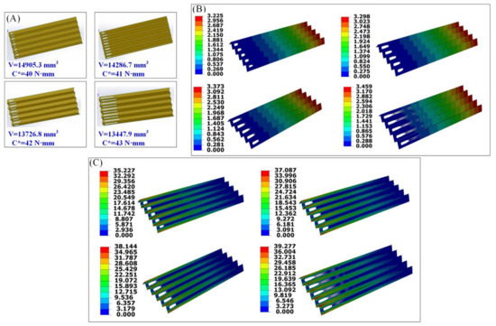 Figure 5B,C separately present the corresponding displacement and stress distribution of the optimal outcomes in Figure 5A. As with the former design problem, the increasing values of the maximum displacement and stress can be clearly seen as the predefined limit for the structural compliance gets larger. Maximum stresses (stress concentration) occur at the areas of the vertices of the Miura-ori-based cantilever. Thus, these vertices should be carefully dealt with when creating the real structures.