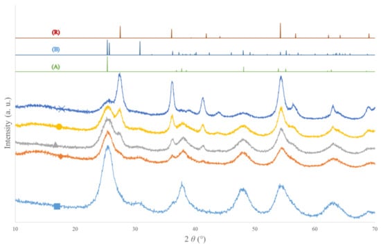 - Mahshid, S.; Askari, M.; Ghamsari, M.S. Synthesis of TiO2 nanoparticles by hydrolysis and peptization of titanium isopropoxide solution. J. Mater. Process. Technol. 2007, 189, 296–300. [Google Scholar] [CrossRef]