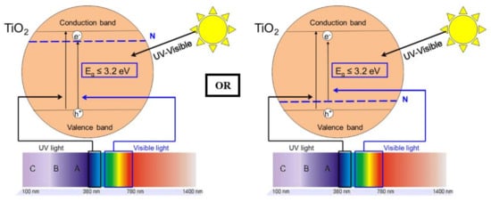 - Gole, J.L.; Stout, J.D.; Burda, C.; Lou, Y.; Chen, X. Highly Efficient Formation of Visible Light Tunable TiO2 - x N x Photocatalysts and Their Transformation at the Nanoscale. J. Phys. Chem. B 2004, 108, 1230–1240. [Google Scholar] [CrossRef]