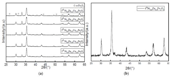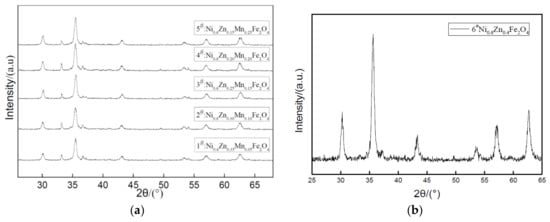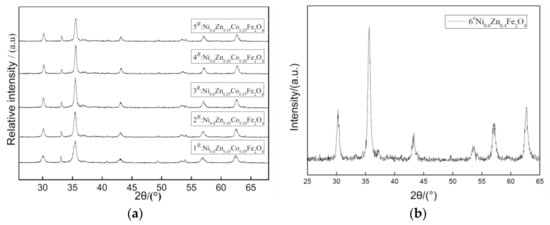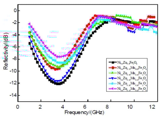 In the unit cell of spinel ferrite, there are many vacancies produced by an ion valence balance between action and the absence of space, which makes it easy to use another metal as a dopant. Ferrite magnetic loss and changes in absorption performance can be realized by doping metal ions with different electromagnetic wave absorption strengths, frequency band widths, and electromagnetic parameters of controlled regulation [5,6]. However, introduction of a dopant does not necessarily improve the performance of the material. Therefore, it is important to study the effect of doping different ions and mixtures in ferrite.
