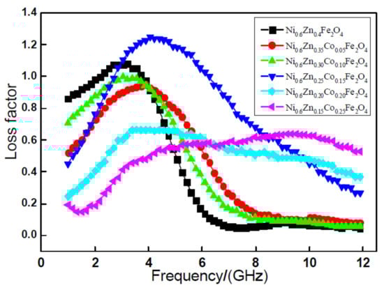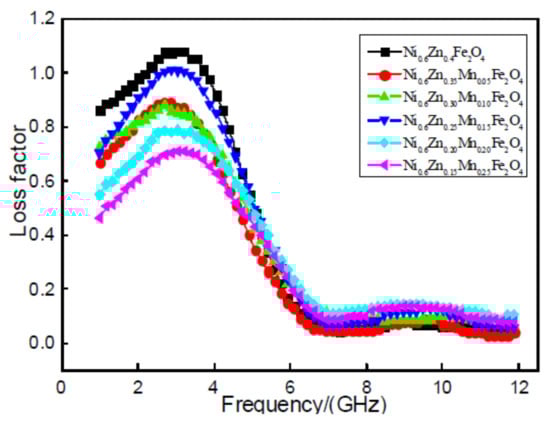 Figure 11 shows the loss factor tanδ of the nanometer Ni0.6Zn(0.4−x)CuxFe2O4. The loss factor is overall consistent while the change in frequency first decreases and then increases. There are no special fluctuations, which illustrates that the Cu2+ doping does not affect the effective frequency band range of the nanometer nickel zinc ferrite magnetic loss in the 1~5 GHz frequency range. With an increase in Cu2+ dopant, the loss factor or tanδ value decreases after a quick increase and then decreases again. When the Cu2+ content is too low, the tangent essentially goes unchanged. When the doping quantity reaches x = 0.15, the loss factor of the material, “the tangent of the tangent of the tangent,” exhibits a large change, which reaches a maximum of 1.17. This is where the absorbance-wave performance is at the highest value. When the Cu2+ content is too high, the tangent of the tangent is smaller and much less than the unadulterated value. As revealed by a comprehensive analysis of the electromagnetic loss, within the 1~12 GHz band, Cu2+ doping did not improve the absorbance area. The appropriate Cu2+ doping amount is necessary to reach the absorbance performance of the reinforced material. When the Cu2+ dose reaches 0.15, the nanometer Ni0.6Zn0.25Cu0.15Fe2O4 is more suitable for electromagnetic dissipation of the electromagnetic waves and, therefore, it performs better.