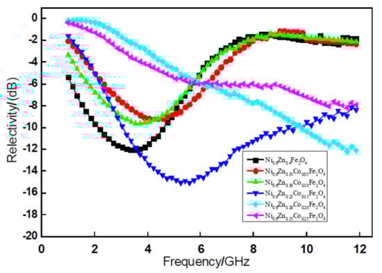 Figure 4 shows the relationship curve of the absorbency reflectivity of 2-mm nanometer Ni0.6Zn(0.4−x)CoxFe2O4. The figure reveals that, within the 1~12 GHz band, the nano nickel zinc ferrite absorbing reflectivity is 12.02 dB, which is valid for the 1~6 GHz frequency band. After doping Co2+, along with an increase in the dopant x, when x = 0.05, 0.10, the absorbing peak reflectivity is 9.21 dB and 9.64 dB. When the Co2+ doping quantity is low, the material’s absorbing effect is not clear. When the doping quantity x = 0.15, the absorbing wave reflectivity is reduced from −12.01 dB to −15.05 dB. The effective band width nearly doubles, but the absorbing wave performance is the highest value. Although an excessive amount of Co2+ doping increased the reflectivity, there was no clear peak value. Even though peaks tend to move to higher frequency, within the test frequency band, the overall wave absorption bands improved significantly. At the same time, by doping Co2+, the absorption peak position can change [17]. The peak value of the curve in the diagram and the corresponding frequency are shown in Figure 3. In this regard, the appropriate amount of Co2+ can effectively be used to increase the absorbance frequency and improve the absorbing performance of the material. Doping Co2+ ions in the ferrite use the compensation of negative anisotropy to achieve a stable domain wall and increase the electromagnetic loss. These factors meet the requirements of electromagnetic wave ferrite devices.