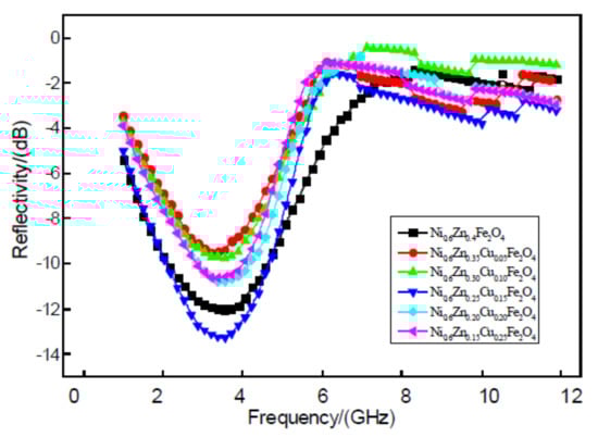 Figure 12 displays a 2 mm nanoscale image of the Ni0.6Zn(0.4−x)CuxFe2O4 material. Within the test range, six samples showed a strong reflectivity absorption peak at 1~5 GHz frequencies while the other peaks were not as intense. With the addition of Cu2+, the position of the strong peak does not change and the wave band does not widen but instead exhibits a slight narrowing. The Cu2+ doping amount at x > 0.15 reveals a greater influence on the reflectivity of the samples. Such reflectivity values of −10 dB are obtained near the 3.5 GHz absorbing peak reflectivity from 12.01 dB down to a dopant concentration of x = 0.15, −13.29 dB. While the absorbance performance improves, the other doping amount of the reflectivity is greater than 12.01 dB. This overall weakens the wave absorption performance of the nanometer nickel zinc ferrite. This may be due to the material’s structure. Zn2+ first enters the tetrahedral holes (A) while Cu2+ and Ni2+ prefer to occupy the octahedral holes (B). At the same time, Fe3+ occupies both A and B [22]. The magnetic moment of Fe3+ is 5 μB. The magnetic moment of Cu2+ (2 μB) is greater than that of Zn2+, which carries no magnetic moment. Because some Cu2+ ions replace A and Zn2+, the B net magnetic moment is reduced, which decreases the magnetic loss and weakens the wave absorption performance. However, just the right amount of Cu2+ could enter the tetrahedral holes by arriving at the location of Fe3+ A. The B to B A net magnetic moment could increase, enhance the A magnetic moment of exchange, and, thereby, increase the magnetic loss. This would then improve wave absorption performance. Therefore, it is possible to apply the appropriate amount of Cu2+ to enhance the absorbing performance of the material.