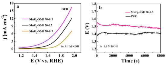 - Meng, Y.; Song, W.; Huang, H.; Ren, Z.; Chen, S.Y.; Suib, S.L. Structure-property relationship of bifunctional MnO2 nanostructures: Highly efficient, ultra-stable electrochemical water oxidation and oxygen reduction reaction catalysts identified in alkaline media. J. Am. Chem. Soc. 2014, 136, 11452–11464. [Google Scholar] [CrossRef] [PubMed]