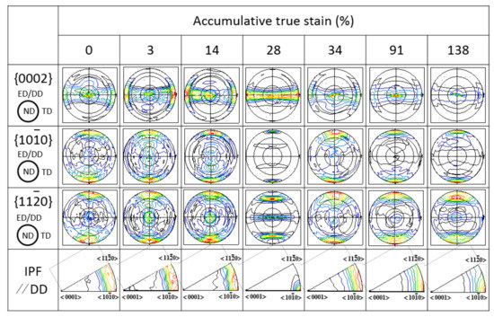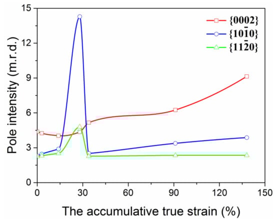 When Mg alloys are processed by cold drawing, the hardness and strength are generally rising with increasing strain, showing a significant work hardening [7,8,9,10]. By contrast, the hardness and strength of pure Mg in this study show a distinct evolution, which is divided into three stages (Figure 1).