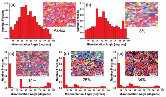 Misorientation angle distributions for pure Mg wire with different ATS: (a) as-extruded, (b) 3%, (c) 14%, (d) 28% and (e) 34%.