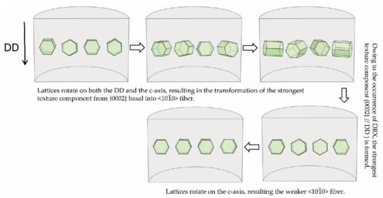 Based on macro-textural analysis, the rotation processing of Mg lattices during cold drawing is schematically illustrated in Figure 6. Lattice rotation is a result of cold-drawing deformation and directly reflects the deformation mode. Hence, it is necessary to further analyze the cold-drawing deformation process. As Figure 6 shows, three principal process should be noted: (i) On the one hand, lattices rotate on the DD and become more uniformly distributed around the circumference, simultaneously accompanied by tilting towards the DD, while on the other lattices rotate on c-axis and from <110>//DD to <100>//DD. Namely, the strongest texture component transfers from as-extruded basal into <100> fiber. This stage is very short, only approximately 28% ATS, but the texture intensity greatly increases, and thus the hardness and strength increase, showing a significant work hardening; (ii) Owing to the occurrence of DRX at room temperature, the basal texture component, {0002}//DD, is formed again. Moreover, owing to the different orientation between the new grain and the deformed grain, the texture intensity is weakened significantly. Therefore, the hardness and strength represent a falling trend, showing an obvious work softening; (iii) Lattices rotate on c-axis and, as the strain increases, the weaker <100> fiber texture is gradually formed again. Only a slight rotation occurs for Mg lattices and the texture intensity slightly increases. At this stage, the hardness and strength maintain a stable level. It can be seen that different lattice rotation processes have occurred during cold drawing, corresponding to different evolution of mechanical properties.