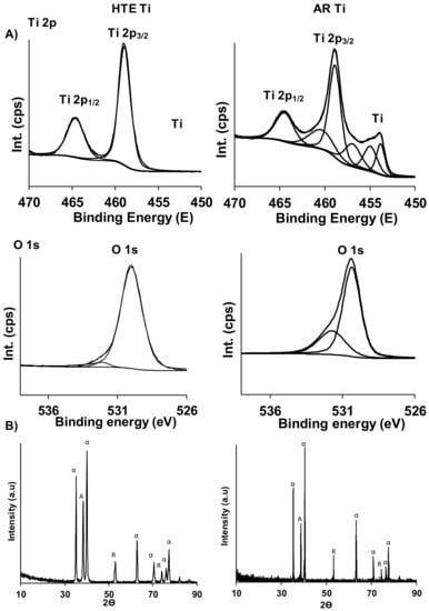 The surface chemical analysis of the AR and HTE Ti surfaces confirmed the formation of titanium dioxide (TiO2) nanofeatures. XPS was used to define the chemical composition of both surfaces. High-resolution scans of the Ti 2p region revealed that the surface nanotopography (post-processing) was predominantly TiO2, while the X-ray diffractograms provide confirmation of a surface with enhanced crystallinity, evidenced by an increase in the anatase (A) phase (Figure 2). No significant differences were observed in the surface chemistry of the AR and HTE-Ti samples. The hydrothermal etching of the Ti substrata resulted in an increase in the surface wettability, decreasing the water contact angle from 58.9° to 23.1°. This increased degree of surface wettability is most likely a result of the formation of nanostructures on the Ti surface [25].