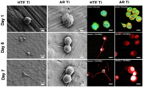 To determine the mechanisms by which the PC12 cells underwent proliferation and differentiation on the HTE-Ti surfaces, the PC12 cells were seeded onto both the nanostructured and non-structured substrata and visualised after 1, 5, and 7 days of incubation. The nanostructured Ti surfaces were not coated with protein in order to effectively determine their suitability as substrata for initial anchorage. After day 1, analysis of the SEM and corresponding confocal laser scanning microscopy (CLSM) images showed that the PC12 cells were successfully attached onto the surface (Figure 3). At day 5, the PC12 cells exhibited a change in morphology, with the beginnings of neurite outgrowths being evident, which is an indication of successful differentiation. At day 7, the PC12 cells exhibited a large neurite growth, extending over the nanostructures. In contrast, the PC12 cells seeded onto the non-structured AR surfaces attached and proliferated over the surface, but failed to differentiate and produce neurite outgrowths, even in the presence of nerve growth factors (NGFs), retaining their rounded morphology. The expression of nestin—the type VI intermediate filament protein that is produced in nerve cells [28,29]—can be seen in the CLSM images (stained red) at day 5 and 7 only for the differentiated cells on the HTE-Ti surfaces. It is evident that the nanostructures present on the HTE-Ti substrates provided focal adhesion points for the neuron-like cells to attach and provide further directional cues for growth and differentiation. The results presented here provide strong evidence as to the biocompatibility of the nanostructured Ti surfaces, with the surface nanostructures clearly affording the surface characteristics that are beneficial for the growth and proliferation of nerve cells. Such surfaces are suitable for use in implant applications without the need for additional surface coatings to encourage the attachment and differentiation of neurons.
