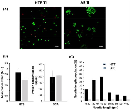 The viability of PC12 cells attached onto nanostructured substrata was estimated by applying a range of qualitative and quantitative bioassays. Live/dead staining yields two-colour discrimination of the population of live and dead cells. Green-fluorescent calcein-AM indicates the presence of intracellular esterase activity, whereas red-fluorescent ethidium homodimer-1 indicates loss of membrane integrity. Fluorescent micrographs in Figure 4A show the proportion of live (green) and dead (red) cells on the HTE and AR substrata. The HTE-Ti surfaces supported the attachment and growth of neuron-like cells, following one day of incubation. In similarity with the smooth control, the numbers of dead cells were negligible (7.4% and 2.0%, respectively). MTS cell proliferation and viability assays (Figure 4B) give a quantitative measure of metabolically-active cells, and showed that the cells attached to all substrata remained viable for the maximum 1-week incubation period. Absorbance readings of the reduced MTS compound highlighted that the surface modification process provided a substratum that actually encouraged cellular proliferation, with increased levels of formazan being present in the culture wells containing the PC12 cells on HTE-Ti; however, no significant difference was detected in the total protein concentration for cells coming into contact with the nanostructured and non-structured substrata. Finally, in Figure 4C, neurite growth also serves to demonstrate the health of attaching nerve cells, with measurements of neurite outgrowths at 7 days showing that ~30% of the cells exhibited growths of 40–60 µm in length, whereas those on non-structured surfaces did not produce growth extensions at all and failed to differentiate, which is typical for these cells on surfaces not coated with protein.