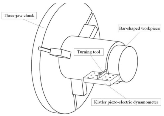 The orthogonal cutting experiments were carried out on a CK7525 CNC Lathe (Bochi Machine Tool Group Co. Ltd., Baoji, China) under dry condition as presented in Figure 2. Bar-shaped workpieces of 140 mm in diameter and 200 mm in length were used, and the cutting forces were measured with a Kistler 9255B dynamometer (Kistler ,Winterthur, Wwitzerland).