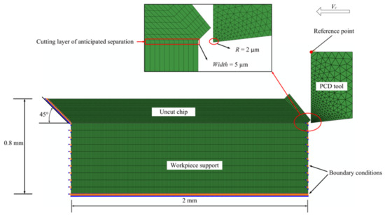 In our simulation model, a cutting layer along the path of anticipated separation was used as the sacrificial layer. To avoid mesh distortion, the width of the cutting layer element should be larger than the cutting edge radius, and it was set as 5 μm in this study. For boundary conditions, the workpiece part was fixed on its bottom, left, and right sides, as well as the left side of the uncut chip part. The rigid tool part was designed to move from the right to the left at a range of cutting speeds (50 m/min–450 m/min) along the cutting layer.
