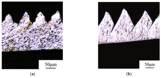 As presented in Figure 3, the deformation of a saw-tooth chip is uneven. Generally, there are several parameters used to describe the geometrical characteristics of saw-tooth chips, such as tooth top and root height (h2, h1), tooth vertex angle and basic angle (θ2, θ1), and pitch d.
