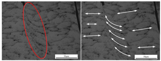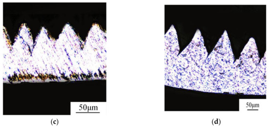 In Figure 17, the cracks extended along the shear plane from the tooth root to the joint inner surface. With the cutting speed or feed rate increasing, the crack length increased, resulting in increasing saw-tooth degrees, as presented in Figure 7. Due to the existence of the small, hard particles, the ductility of in-situ TiB2/7050Al MMC was reduced. The initial crack would produce when the shear plane was to form as shown in Figure 13d and Figure 15d. Then, under great stress and high temperature, the crack extended with the formation of the shear plane. As a result, the segment was fully formed under the combined effect of the adiabatic shear instability, shearing slip, and crack extension.
