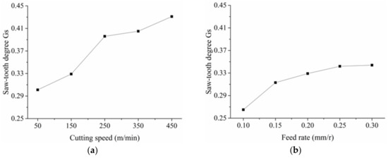 Figure 7 shows the relationship between the saw-tooth degree Gs and the cutting speed and the feed rate. With cutting speed increasing, the adiabatic shear instability takes place more easily, which resulted in larger chip deformation and increasing saw-tooth degree. As the feed rate increased, the uncut chip thickness increased accordingly. Then, the hardening during cutting was strengthened, leading to low chip flow speed. Hence, the saw-tooth degree increased as the feed rate increased.