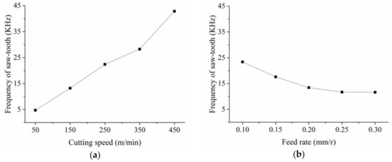 Figure 8 presents the change of the frequency of the saw-tooth. From Equation (2), it is obvious that the frequency f would increase as the cutting speed increases. However, as the feed rate increased, the frequency f decreased slightly, as shown in Figure 8b. With feed rate increasing, the chip deformation increased accordingly, which could also be seen from the change of saw-tooth degree in Figure 7b. Hence, the chip flow speed decreased and decelerated the saw-tooth formation process. As a result, the frequency f decreased as the feed rate increased. In addition, from Figure 7b and Figure 8b, it could also be found that the feed rate has a small effect on the saw-tooth degree and the frequency. On the contrary, the effect of the cutting speed on the saw-tooth degree and frequency was great.