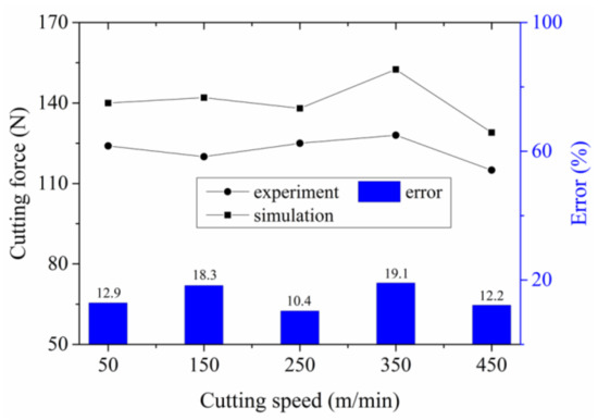 Figure 10 presents the cutting forces and relative errors of the simulation and experimental results. From our analysis, it was obvious that the simulated cutting forces were larger than that of the experiments. The J–C material constitutive equation used in the simulation was obtained from basic orthogonal cutting tests. However, the J–C damage criterion, which is more suitable for metal chip separation with using the J–C constitutive equation, is not available for this new kind of in-situ TiB2/7050Al MMC. Then, the shear damage, which was based on the material equivalent plastic strain, was used for chip separation. As the tool nose moved, the material in front of the tool was separated, and the material shear strain occurred. However, during simulation, the material equivalent plastic strain of the node, which was in front of the tool nose and should be damaged and separated, was usually smaller than the given value resulting in delayed fracture. This may be the reason why the simulated cutting force was larger than that of experiments. In addition, a cutting layer for anticipated separation, which did not exist in the real cutting, was applied, and this could also produce errors between the simulation and experiment results.