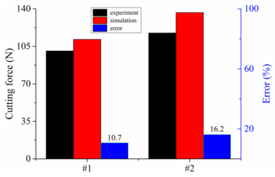 Two more tests, which are shown in Table 7, were performed to verify the veracity of the obtained material constitutive equation and the FEM simulation model. Figure 11 shows the results of the verification tests between the cutting and simulation experiments. In Figure 11, the experimental cutting forces were smaller than the simulated forces due to the same reason as discussed above. It can also be seen from both Figure 10 and Figure 11 that the simulation results show good agreement with the experiment results, with relative errors being smaller than 20%.