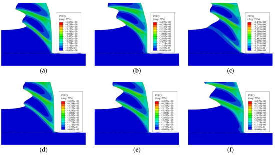 From the analysis presented in Figure 13, it could be seen that the uncut chip material in front of the tool suffered from plastic deformation. The equivalent plastic strain of adiabatic shear band was about 2.8. From Figure 13c,d and Figure 14, the formation process of the shear plane and shearing slip phenomenon was clearly observed.