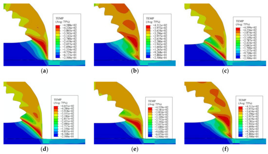 The cutting temperature of the chip is presented in Figure 15. Correspondingly, the six stages in Figure 15 were the same as that in Figure 13. In Figure 15a, there were three fully formed saw-tooth chip segments, and the next new segment formation was about to begin. From the temperature nephogram in Figure 15a, it can be seen that the temperature in the shear plane zone, which was about 420 °C, was higher than the other parts of the chip. With cutting tool moving, the uncut chip material was under increasing stress and was exposed to the cutting temperature, which can be seen from the increasing temperature of the uncut chip material in front of the tool nose in Figure 15b. Meanwhile, the formed chip slipped along the tool rake face, and the temperature kept increasing due to heat transmission from the shear plane. As the cutting proceeded, most of the formed chip had separated from the rake face, and the temperature decreased accordingly, as shown in Figure 15c. In this stage, the shear plane of the new segment was newly formed and the temperature in this area was much higher than in other parts. Under increasing stress, the temperature of the shear plane kept increasing, and the adiabatic shear instability occurred as presented in Figure 15d. Then, the formation of the new segment continued due to the material shearing slip, and the temperature of the shear plane rose to 450 °C. At the same time, the temperature of most of the formed chip rose to 340 °C due to heat transmission from the shear plane. In Figure 15f, the new segment was fully formed, the formed chip slipped along the tool rake face, and the next new segment was about to form.