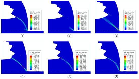 Strain rate under condition of vs = 450 m/min, fr = 0.2 mm/r: (a) the fully formed saw-tooth segments; (b) the new segment began to form; (c) the development of the shear plane; (d) adiabatic shear instability in the shear plane; (e) shearing slip of the chip material; and (f) the new saw-tooth segment was fully formed.