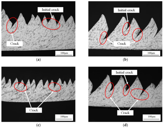 Cracks in the formed chips: (a) vs = 50 m/min, fr = 0.2 mm/r; (b) vs = 450 m/min, fr = 0.2 mm/r; (c) fr = 0.1 mm/r, vs = 150 m/min; (d) fr = 0.3 mm/r, vs = 150 m/min.