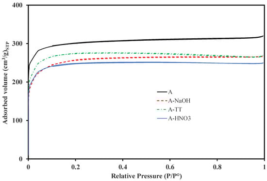 Nitrogen adsorption isotherms obtained at −196 °C for the different AC samples, before (A) and after the surface treatment (A-HNO3, A-NaOH and A-TT).