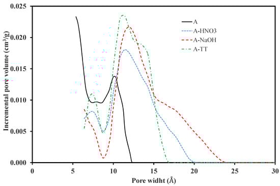 The pore size distributions (PSDs) of the different samples were estimated using the nonlocal density functional theory (NLDFT) method. The results are presented in Figure 4. Sample A presents a mono-dimensional PSD centered in the ultramicropore range (maximum of the pore width distribution lower than 1 nm). All other samples, and in particular the NaOH–treated sample, display a wider PSD in the micropores range (pore width between 0.6 nm and 2.5 nm). This wide value range can be attributed to the enlargement of the micropores due to the destruction of the basal planes.