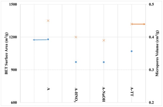 The textural properties of the carbon materials deduced from the nitrogen adsorption isotherms are reported in Figure 5. As expected, sample A has the highest surface area and the best developed internal porosity. The activated carbons are essentially microporous. In addition, all the surface treatments led to the decreasing of their pore volume and surface area. The surface treatments that most strongly impact the parent activated carbon porosity are those performed with nitric acid and NaOH. The decreasing of the microporous volume for the treated samples can be related or to newly created oxide functional groups that might block the access to the micropores, or to coalescence processes that involve parts of the micropores and are derived from the destruction of the micropore walls due to oxidation. Shim et al. [] observed that, because of the high stability of the graphite basal planes, oxygen surface groups are expected to be located at the edges of the basal planes and are relatively weakly bonded to the carbon structure.