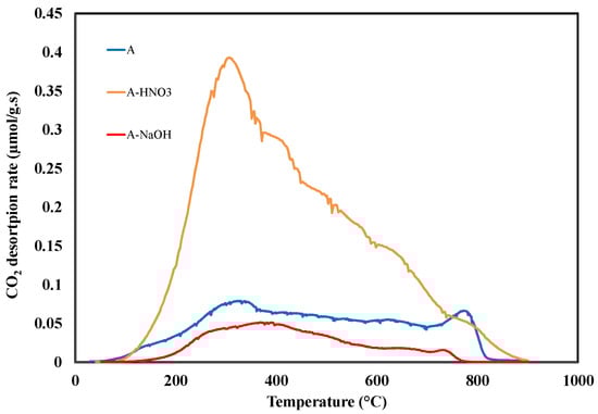 CO2 desorption profiles of sample A and samples of A treated by HNO3 or NaOH.