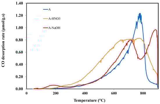 CO desorption profiles of sample A and samples of A treated by HNO3 or NaOH.