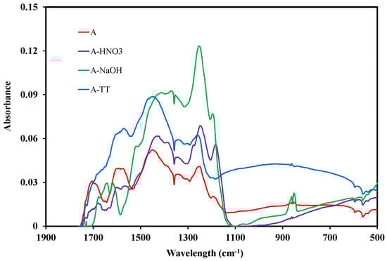 Various bands and peaks were observed for the different samples. A broad and intense shoulder between 3000 and 3500 cm−1 (not shown on Figure 8) was observed for samples A and A-HNO3, and was associated to the stretching vibrations of the hydroxyl groups of water adsorbed on the surface []. The band centered around 1700 cm−1 is ascribed to the stretching vibrations of C=O bond in the carboxylic acid and lactone groups []. This band was also detected for the A and A-HNO3 samples. The peaks observed between 1580 and 1700 cm−1 are attributed to the elongation vibration of the C-O group in the oxygenated surface groups such as lactone, carboxylic acid, and quinone [,]. These peaks were detected for all the samples. The peak around 1640 cm−1 for A-NaOH sample may be attributed to a C=O bond of quinone rather than carboxylic acid. The band at 1250 cm−1 is assigned to C-O stretching and O-H bending modes of alcoholic, phenolic and ether groups [].