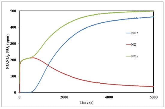 Figure 9 shows the out-streaming concentrations of NO and NO2 gases recorded during NO2 adsorption tests performed on 100 mg of the activated carbon (A) at ambient temperature with 500 ppm NO2 concentration feeding gas. The NOx curve represents the cumulative concentrations of NO and NO2.