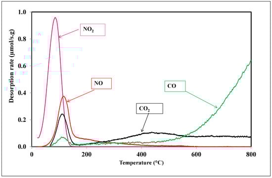 At the end of the adsorption step, a temperature-programmed desorption analysis was performed under nitrogen stream by heating the sample from room temperature to 800 °C at a heating rate of 5 °C/min. NO2, NO, CO2 and CO emissions were recorded as a function of temperature and shown in Figure 10. During the TPD experiment, several peaks were observed at different temperature intervals. Such behavior confirms the formation of various surface species during the adsorption of NO2.