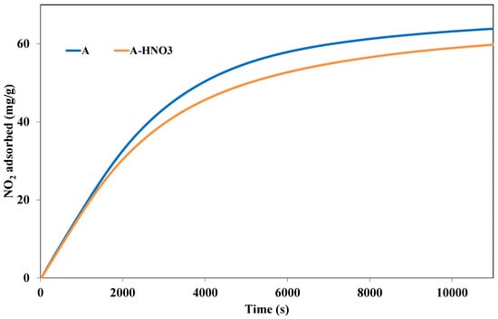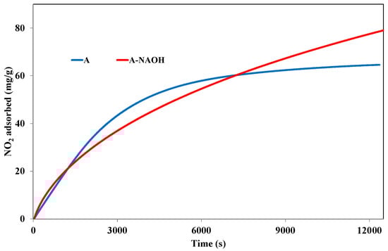 In order to further understand the influence of the activated carbon surface properties on the adsorption of NO2, the activated carbon A treated with NaOH was also tested in NO2 adsorption tests. Figure 12 shows the comparison between the evolutions of the adsorption capacities for samples A and A-NaOH. Clearly, the adsorption capacities increased from 64.5 mg/g for sample A to 79.1 for sample A-NaOH. This increase may be attributed to the formation of basic groups at the surface of the activated carbon after the NaOH treatment or to the partial neutralization of acid groups that, as previously showed, have a negative effect on the NO2 adsorption capacity. Moreover, the treatment with NaOH may generate free oxygen sites (C*O) available for NO2 chemisorption.