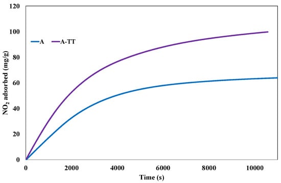 The adsorption capacity of the thermal treated activated carbons (A-TT) is compared with reference activated carbon A. The cumulative adsorption capacities of NO2 obtained with these two samples are presented in Figure 13.