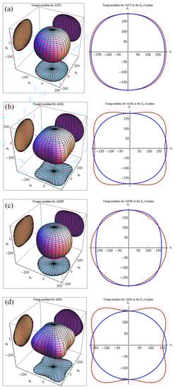 Micro-cracks are easy to induce in materials because of significant elastic anisotropy [49]. Therefore, elastic anisotropy should be calculated to predict the mechanical durability of materials. A 3D curved surface, which represents the dependence of elastic properties on crystallographic directions, can indicate the elastic anisotropy of crystal structures. The Young’s moduli with directional dependence for tetragonal crystal are defined in Equation (15) [50].