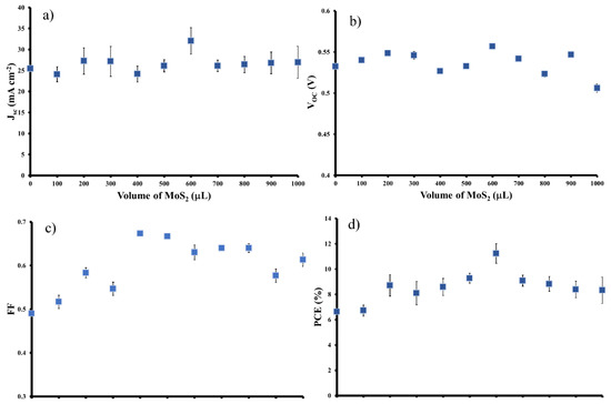 MoS2 exhibits robust mechanical properties. It has good photo-responsivity when used as a monolayer, allowing use in innovative solar cell devices [24]. When MoS2 and CNTs are combined, they can provide novel photovoltaic devices with excellent performance. The performance of SWCNT/n-Si hybrid solar cells also depends on the thickness of the CNT film, particularly for films with an average transmittance above 70% [11]. Other research studies done in this field have shown that the addition of a conducting polymer, such as polyaniline, into the CNT film enhances electrical conductivity and therefore, improves the performance of the solar cells [25].