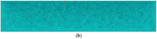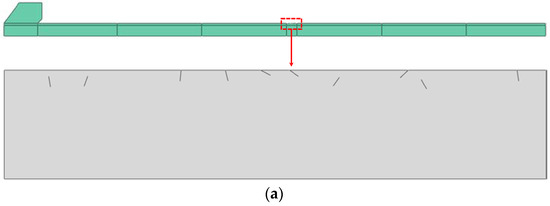 The size of the FEM model is 240 × 6 mm. Since at least 20 elements are required in the wavelength of the highest excitation frequency waves (2000 kHz in this study), from the aspect of numerical accuracy, at least 6 elements for each crack are employed with certainty, and the element size for the non-crack zone is set to Lmax = 0.08 mm. The FEM model is constructed using the four-node plane strain (CPE4R) elements, as shown in Figure 2.