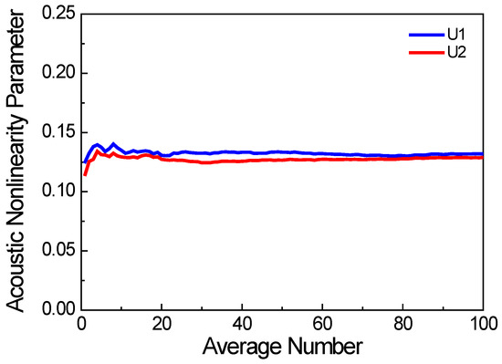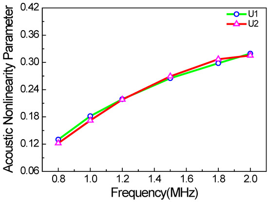 To date, a substantial number of experiments have demonstrated that the nonlinear ultrasonic detection technique, based on the second harmonics of bulk waves, Lamb waves, and Rayleigh surface waves, is effective for detecting changes to the microstructure of metal materials [26]. The amplitude of the second harmonic waves can be quantitatively evaluated using the acoustic nonlinearity parameter.