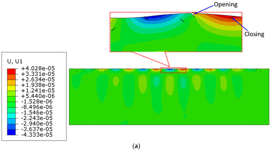 The dynamic displacement excitation applied to the flank of the wedge can be expressed as , where is the amplitude of excitation signal (1 × 10−4 mm in this study [8,27,28]) and f is the frequency of the excitation signal (ranging from 800~2000 kHz). In addition, the frequency needs to be low enough to satisfy the low frequency assumption, leading to λ/a ≈ 20, where λ is the wavelength and a is the half-crack length [24]. Furthermore, the non-reflecting or absorbing boundary conditions at the bottom and right edges of the FEM model are used to maximally eliminate the influence of boundary reflection.