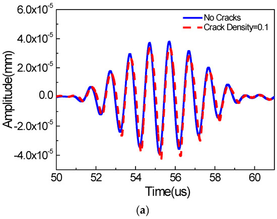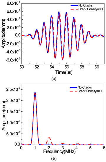 Figure 5 and Figure 6 show wave signals collected at the signal detection position (0 mm away from the right boundary of the micro-crack zone) in the x and y directions, respectively, wherein the wave signals for the non-cracked case are marked by the solid line, and the wave signals for the cracked case are marked by the dashed line. We can see that the energies of the wave signals in the x and y directions are almost identical. Moreover, the time-domain signals for the non-cracked case and the cracked case in the x and y directions are very similar, as shown in Figure 5a and Figure 6a, respectively. More obvious differences can be observed from the frequency analysis of the wave signals (Figure 5b and Figure 6b). We find that the wave signals for the non-cracked case marked by the solid line only contain the 1000 kHz wave signals (the fundamental waves), indicating that the second harmonic waves cannot be generated for the non-cracked case. However, the wave signals for the cracked case, marked by the dashed line, contain not only the 1000 kHz wave signals, but also the 2000 kHz wave signals (second harmonic waves) and even distinct 3000/4000 kHz wave signals (third/quadruple harmonic waves), implying that the existence of micro-cracks is the critical factor for generating the second harmonic waves. Meanwhile, the third and quadruple harmonic waves for the case of Rayleigh surface waves are more remarkable compared to the cases of bulk [24] and Lamb [8] waves. Here, from numerical simulations, we find that, when using Rayleigh surface waves, micro-cracks could generate the second harmonic waves. Therefore, this study provides a foundation for some possible new techniques for identifying surface micro-cracks in a structure using Rayleigh surface waves.