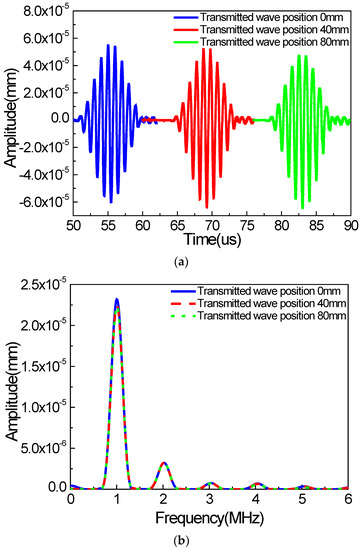 Next, the wave signals collected at 0 mm, 40 mm, and 80 mm, away from the right boundary of the micro-crack zone, are shown in Figure 7 (in the y direction). We can find that the waveforms of Rayleigh surface waves collected at different locations are the same, indicating that the second harmonics from the received signal are independent from the signal detection position. And the same tendency can be found in the x direction. If there exists damping, the amplitudes of the fundamental waves and the second harmonics could be reduced, but nevertheless, the acoustic nonlinear phenomenon cannot be affected significantly.