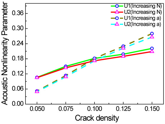 However, the contact acoustic nonlinearity caused by cracks is different from classical acoustic nonlinearity. Therefore, a different acoustic nonlinearity parameter is used in this study [22,23,24], where A1 and A2 are, respectively, the amplitudes of the fundamental and second harmonic waves. This parameter is related to the crack density, the frequency of fundamental waves, the propagation distance, and the friction coefficient.